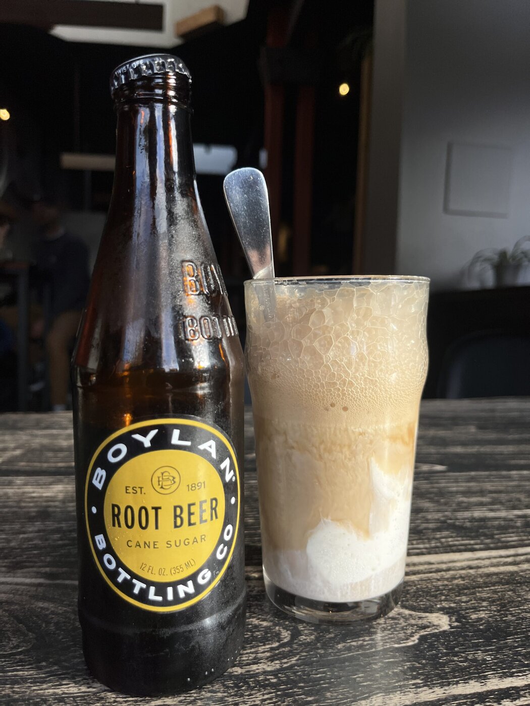 A Bottle Of Boylan Root Beer Stands Next To A Glass Filled With A Root Beer Float—Vanilla Ice Cream Topped With Foamy Root Beer. A Metal Spoon Rests Inside The Glass On A Wooden Table.