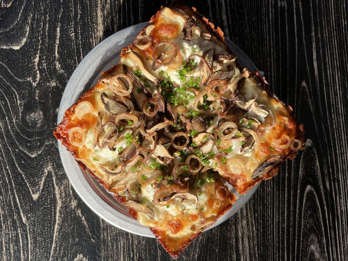 A Close-Up Top View Of A Square, Thick-Crust Pizza Topped With Caramelized Onions, Mushrooms, Melted Cheese, And Chopped Chives, Served On A Round Metal Tray Over A Dark Wooden Surface.