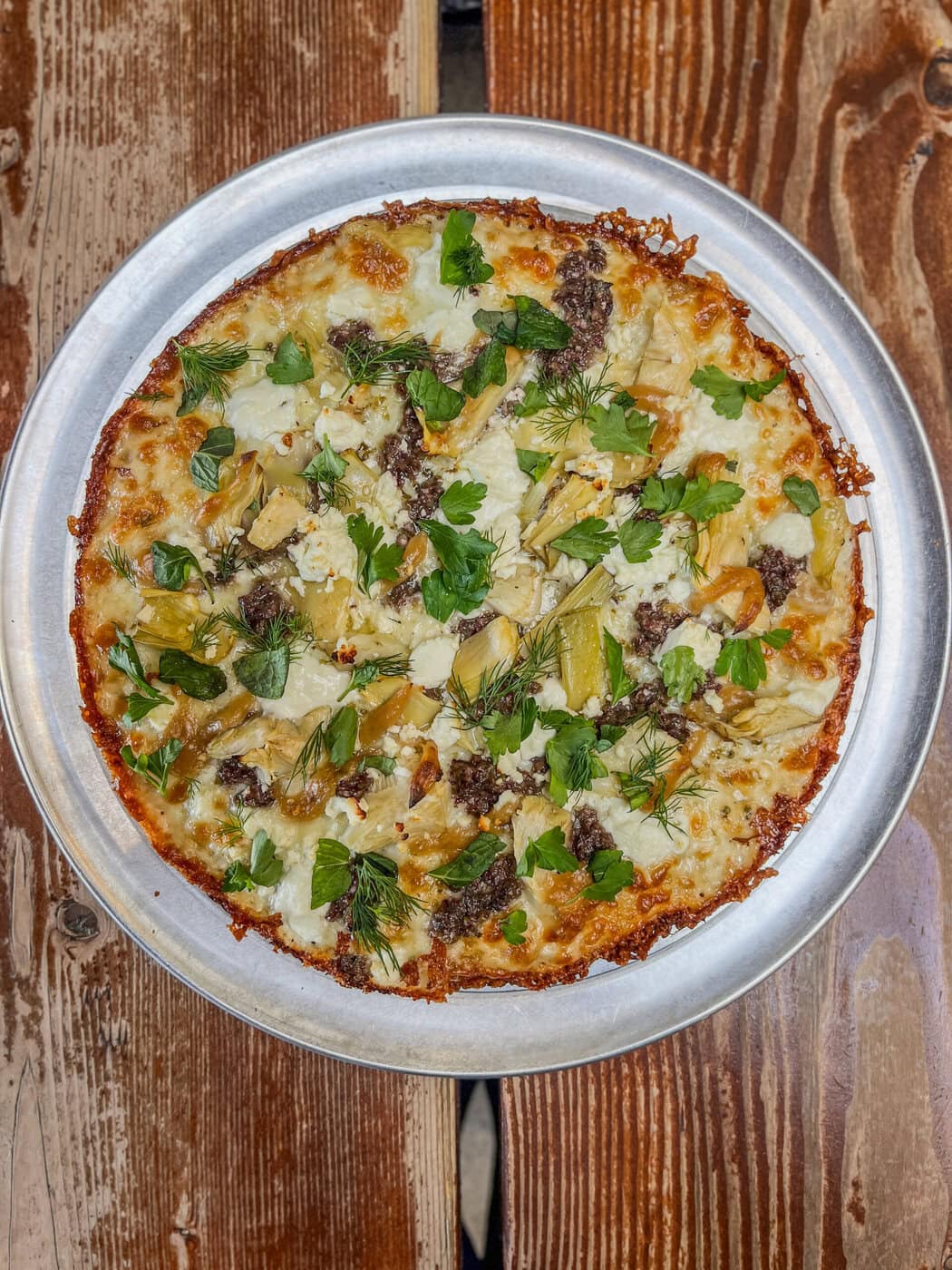 A Round Pizza Topped With Cheese, Herbs, Artichoke Hearts, And Sausage On A Silver Tray, Placed On A Rustic Wooden Table.