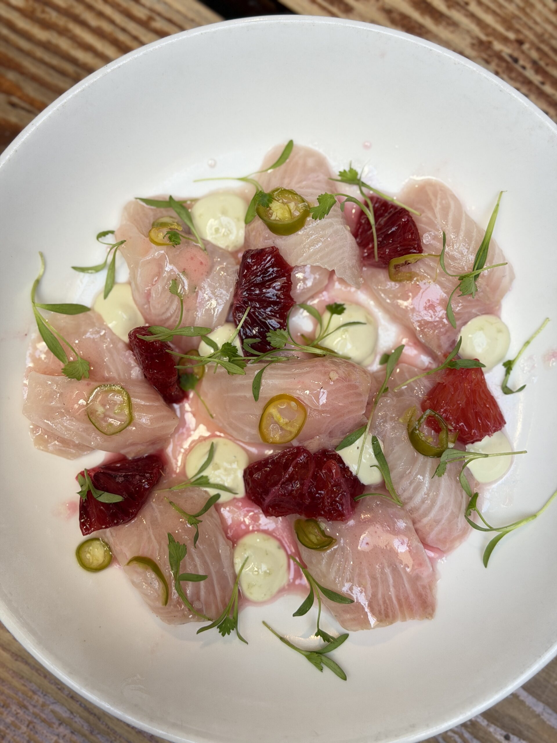 Kanpachi (yellow tail) Fish, Blood Orange, Blood Orange Vinaigrette, Pickled Serrano, Avocado Lime Crema, Cilantro