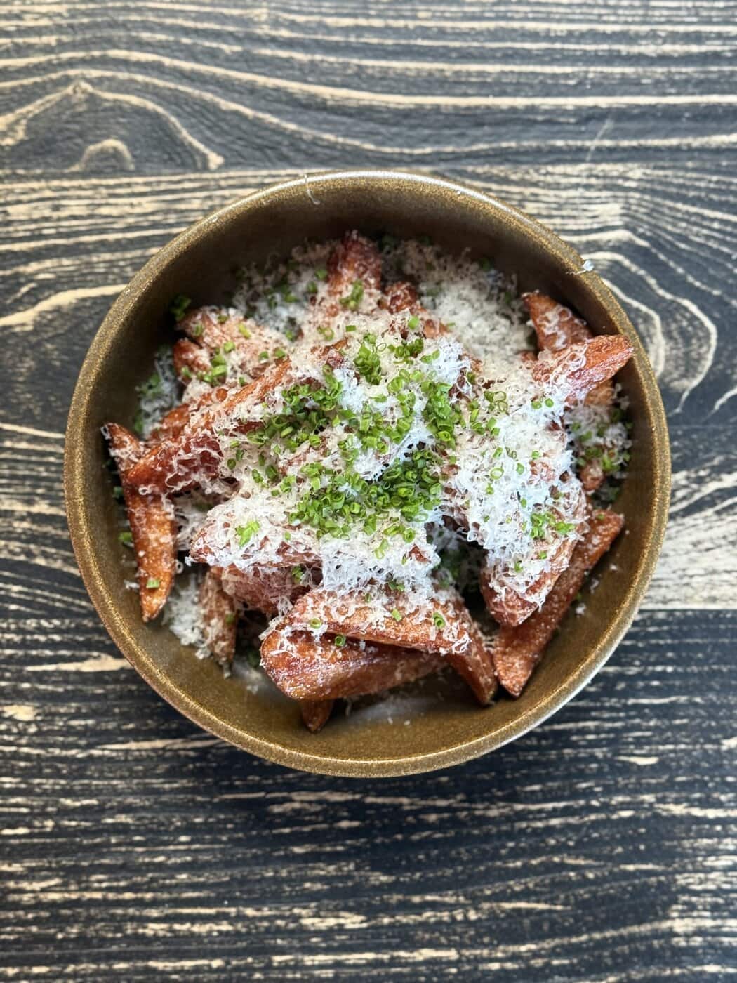 A Bowl Of Crispy Sweet Potato Fries Topped With Grated Cheese And Chopped Herbs, Served On A Dark, Textured Wooden Surface.