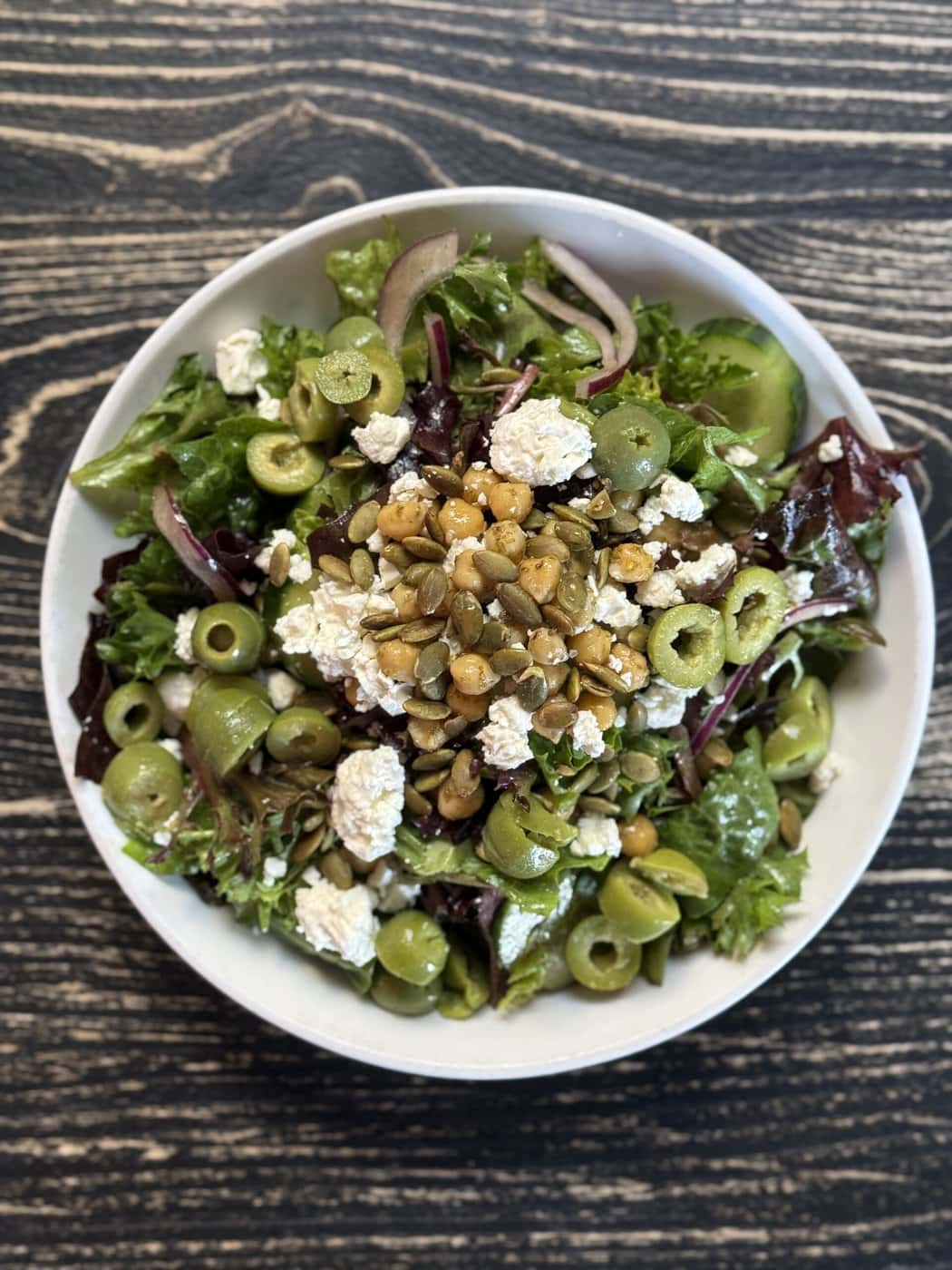 A Bowl Of Green Salad With Sliced Green Olives, Crumbled Feta Cheese, Roasted Chickpeas, And Pumpkin Seeds On A Dark Wood Surface.