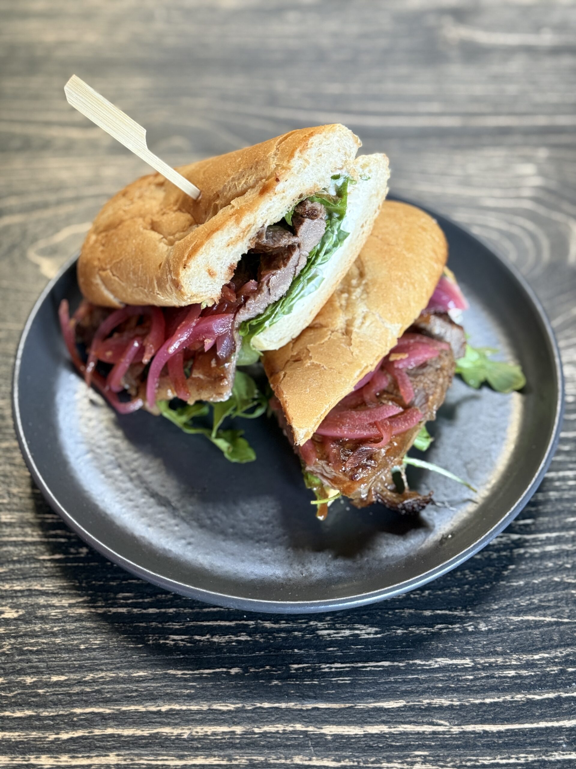 A Sandwich Cut In Half On A Black Plate, Filled With Sliced Beef, Pickled Red Onions, Leafy Greens, And Served On A Rustic Wooden Table.
