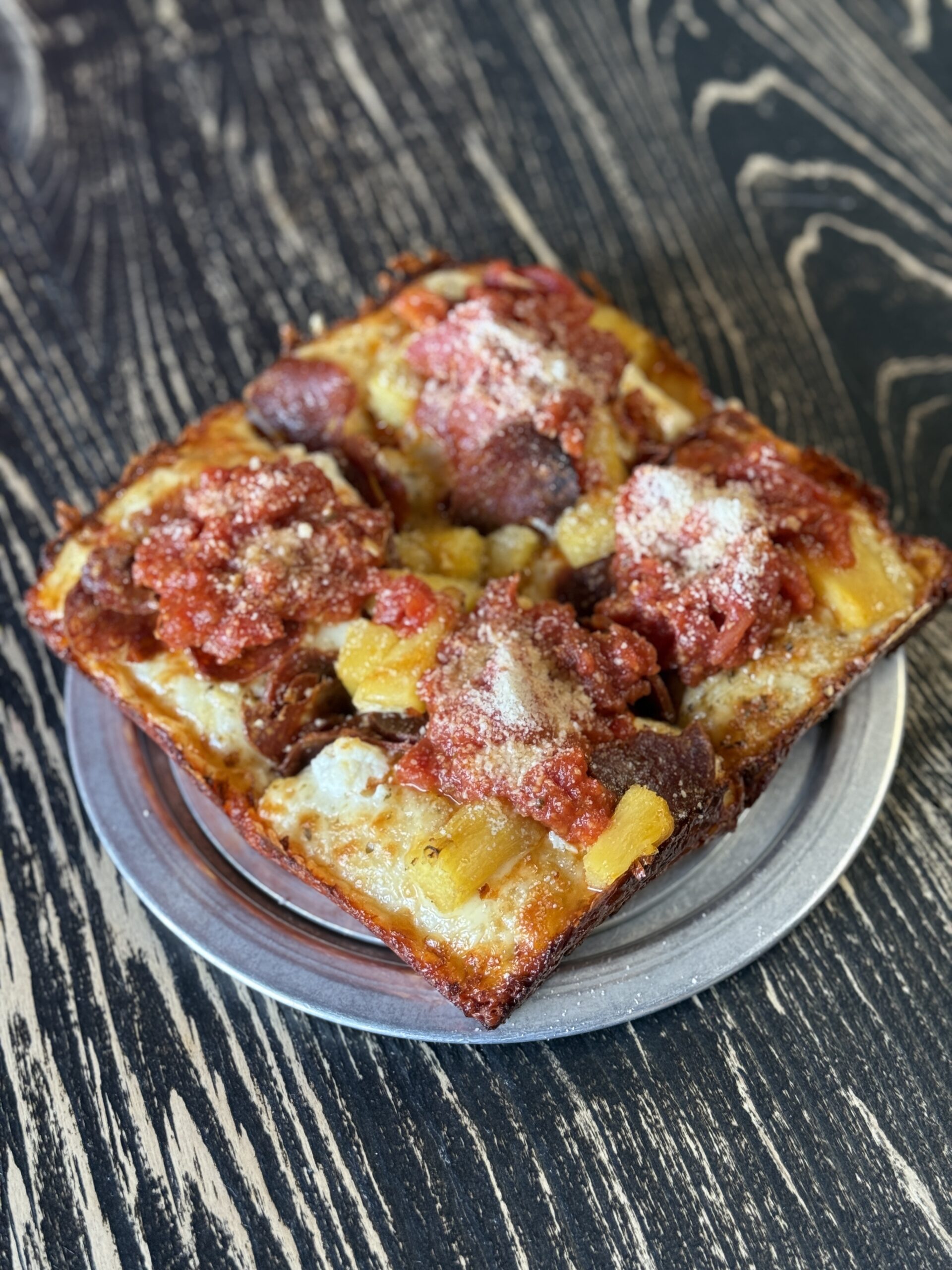 A Square Slice Of Detroit-Style Pizza Topped With Pepperoni, Sausage, Tomato Sauce, Melted Cheese, And Parmesan Sits On A Round Metal Plate Over A Dark, Wood-Grain Table.