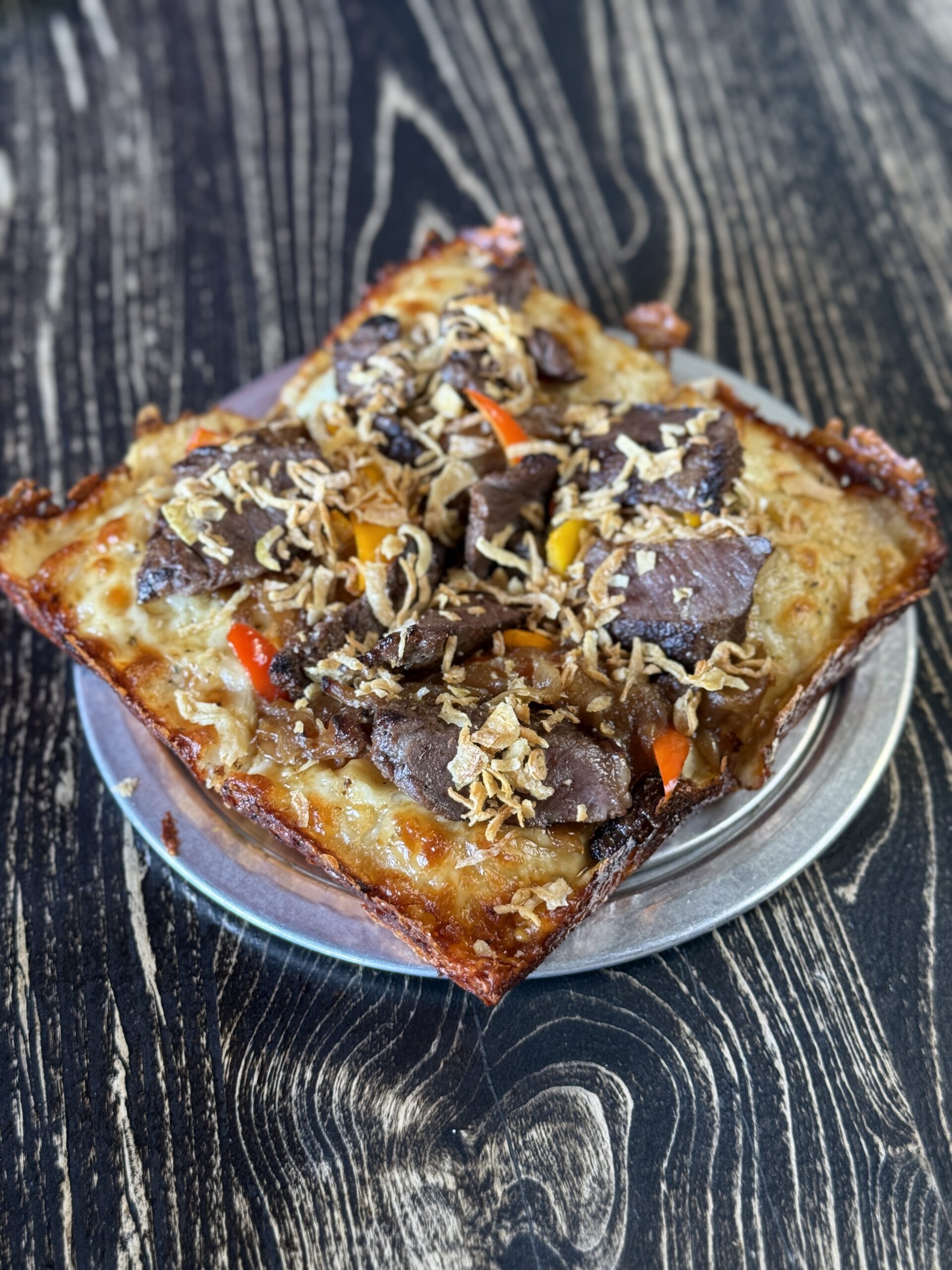 A Square Slice Of Pizza Topped With Beef, Caramelized Onions, Crispy Fried Onions, And Sliced Red And Yellow Peppers, Served On A Metal Plate Over A Dark Wood Table.